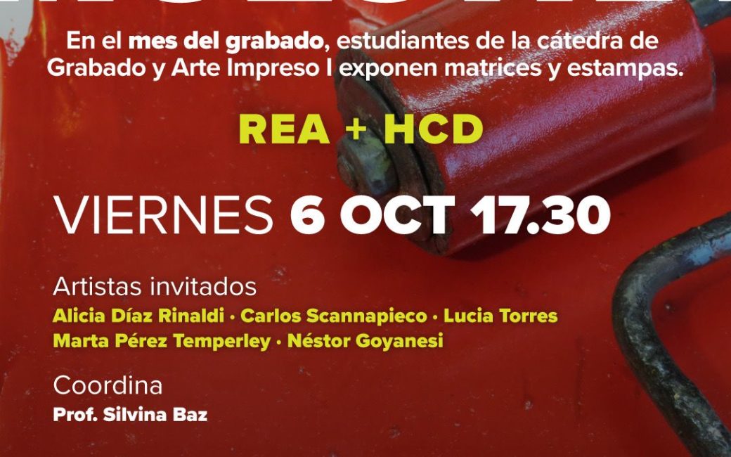 06/10/23 | Exposiciones REA + HCD En el mes del grabado estudiantes de la cátedra de Grabado y Arte Impreso I exponen bocetos, matrices y estampas para presentar «El mundo del grabado». En la muestra se podrá apreciar diversidad de técnicas y procesos creativos. Prof. Silvina Baz Curadora de la muestra.Artistas invitados: Alicia Díaz Rinaldi, Carlos […]